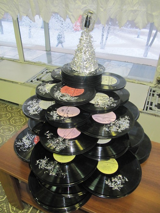 Ушедшие в небытие дискеты прекрасно будут смотреться на hi-tech-елке из дисков или пластинок, неожиданно став новогодними игрушками.