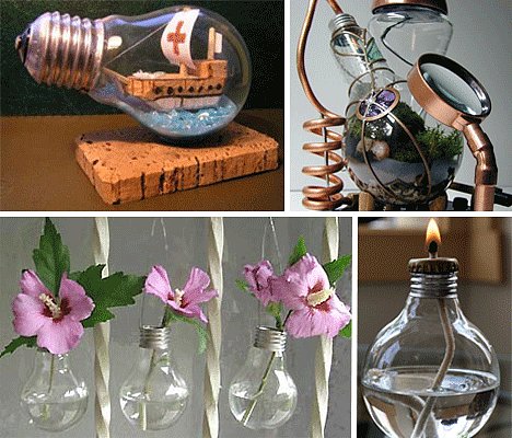 Пустые пластиковые бутылки могут стать материалом для создания множества практичных вещей — от сандалий до небольшой лодки. Из перегоревших ламп накаливания можно сделать декоративные свечи, вазы для миниатюрных цветов, емкости для так называемого сада в бутылке и даже елочные игрушки.